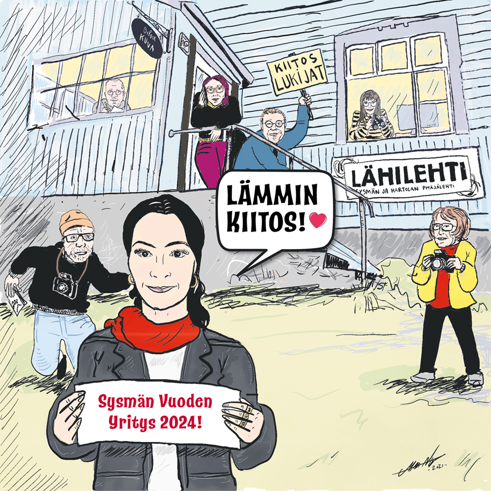 Lähilehden valinta Sysmän Vuoden 2024 Yritykseksi on meille merkityksellinen asia: Lähilehteä tilattavana sanomalehtenä kunnioitetaan ja meidän tekemistämme arvostetaan. On meille tärkeää, että Lähilehden jutut ovat niin tuoreita, kuin vain on mahdollista ja noudatamme jutuissa puolueetonta journalismia. Lähilehteä tehdään kuntalaisille, aivan kaiken ikäisille mutta myös valtavan suurelle joukolle alueiden vapaa-ajan asukkaita. Hyvät tilaajat, kiitos! Olette meidän arvokkaita asiakkaitamme ja on myös teidän ansiotanne, että Lähilehti on tänä vuonna Sysmän Vuoden Yritys.