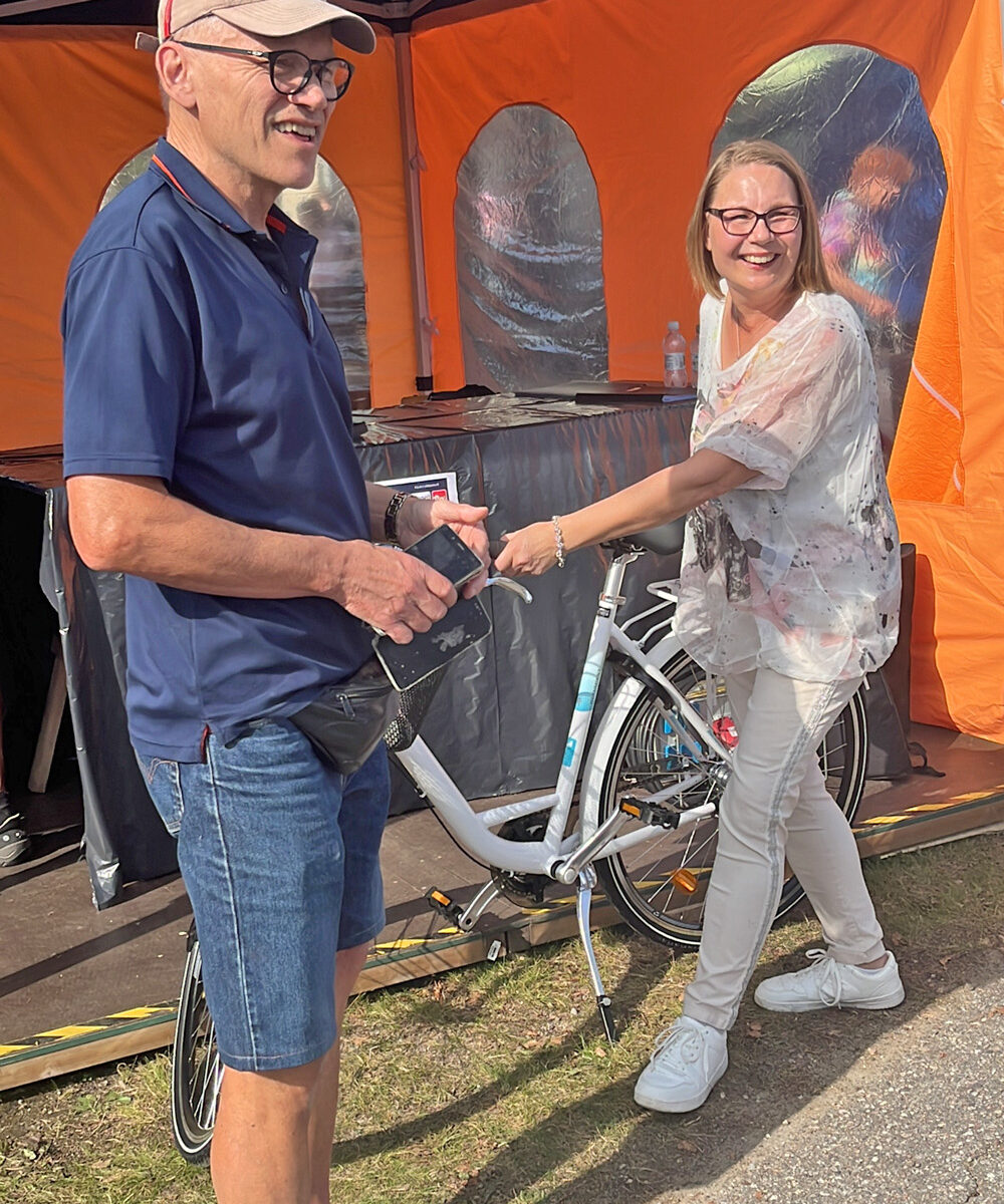 Kuvassa: Jussi Tiitinen luovuttaa pyörän iloiselle voittajalle, Päivi Kyyhkyselle.