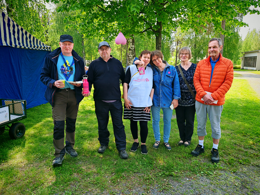 Kuvassa: Tero Mäyrä (vas.), Tuomo Sinisalo, Kirsi Männistö, toimittaja-Helena, Leila ja Markku Siihola. Tiukan petankkikisan voittajaksi pinnisti ensikertalainen Tuomo Sinisalo, Siiholat toimivat hauskan kisan järjestäjinä.